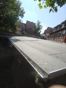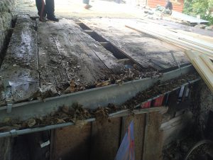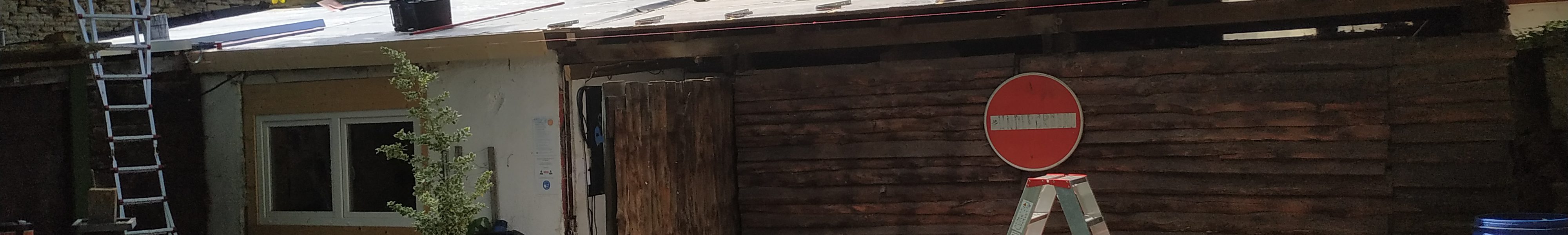 Aber nicht nur Ziegel mussten entfernt werden. Die alte Dachrinne sowie der mit Bitumen bedeckte Teil wurde abgedeckt. Die zum Teil morsche Unterkonstruktion wurde vorsichtig entfernt um noch intakte Teile nicht zu beschädigen. Unter Anleitung eines Dachdeckers konnte so in Eigenleistung innerhalb von zwei Tagen das Dach komplett für die Neueindeckung vorbereitet werden. In der darauffolgenden Woche wurde das Dach von der Firma Stock Dach GmbH teilweise neu beplankt und mit zwei Bitumenbahnen eingeschweißt.