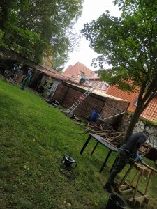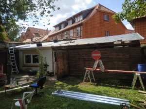Im Sommer starteten wir mit unserem Projekt, der Renovierung unserer Fahrradselbsthilfe-werkstatt. Nachdem im Außenbereich der Werkstatt Platz für die Lagerung der alten Ziegel geschaffen wurde und das Dach von Laub befreit war, konnte die alte Dachabdeckung entfernt werden. Die Lagerung der alten Ziegel ist besonders wichtig, da das Hauptgebäude des Soziokulturellen Zentrums ebenfalls mit diesen gedeckt ist und diese nicht mehr hergestellt werden. Somit steht nun bei Bedarf genügend Ersatz zur Verfügung.