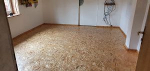 Im November wurden dann die Innenarbeiten durchgeführt. Nachdem das Material und der Transport für den Neuaufbau des Fußbodens organisiert und die Werkstatt ausgeräumt war, nutzten wir die leere Werkstatt für einen Neuanstrich. Im Anschluss wurde der Betonboden ausgeglichen und eine Unterkonstruktion eingebaut. Neue 15mm starke OSB-Platten wurden verlegt und anschließend mit Speziallack versiegelt.