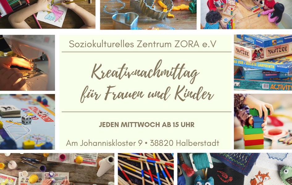Ab dem 27. März 2019 bietet das Soziokulturelle Zentrum ZORA e.V. mittwochs ab 15 Uhr einen Kreativnachmittag für Frauen und ihre Kinder an. Während die Kinder Gesellschaftsspiele spielen, basteln, malen und sich kreativ ausprobieren können, wird ihren Müttern eine Plattform geboten für persönlichen Austausch, Inspiration oder einfach als Ort zum Verweilen. Durch Zeit für Gespräche, viel Spaß und Kreativität soll eine attraktive Freizeitmöglichkeit für Mütter und ihre Kinder in der Stadt geschaffen werden.